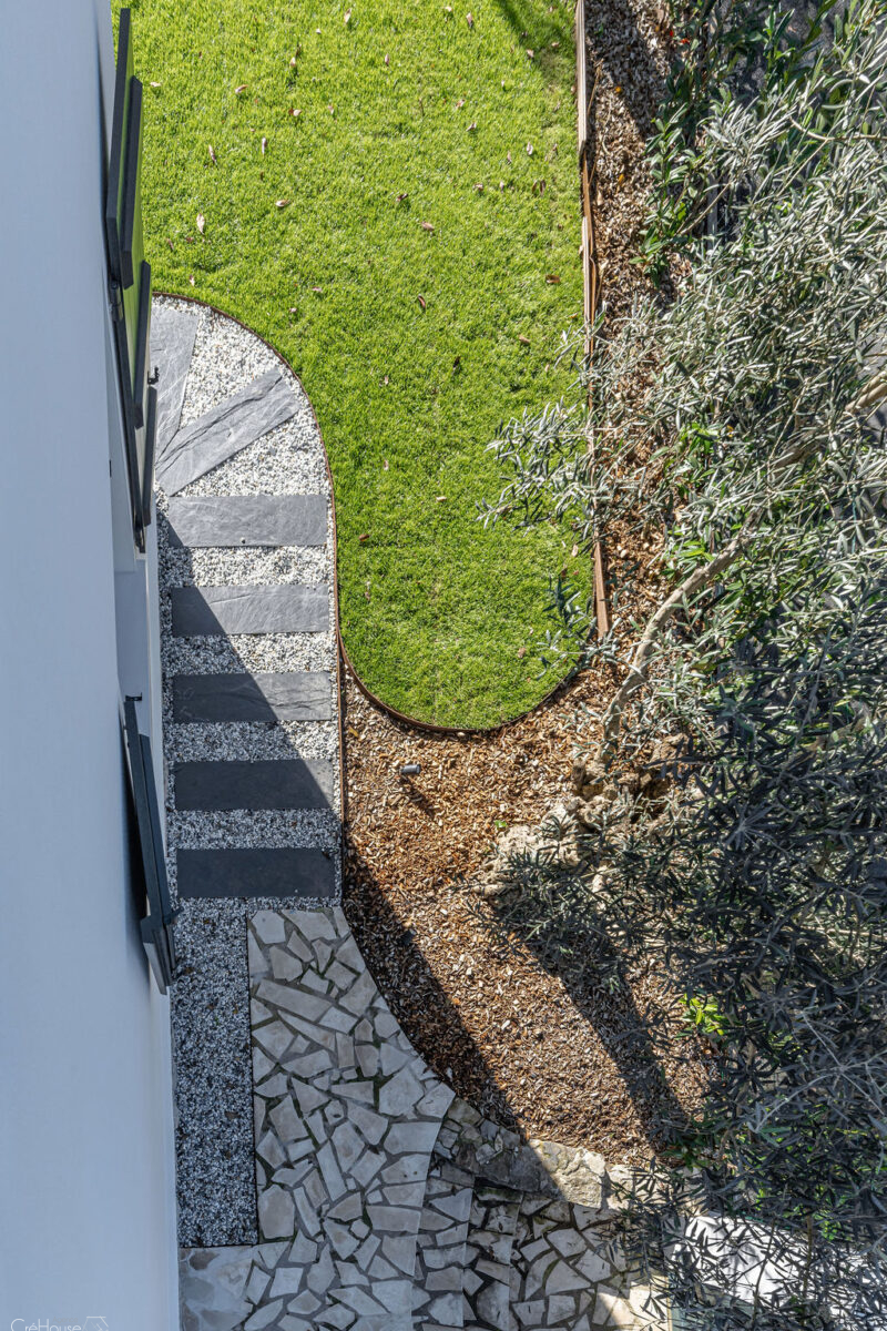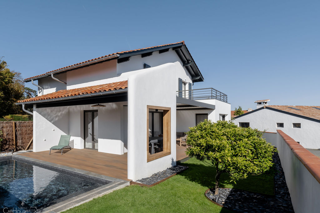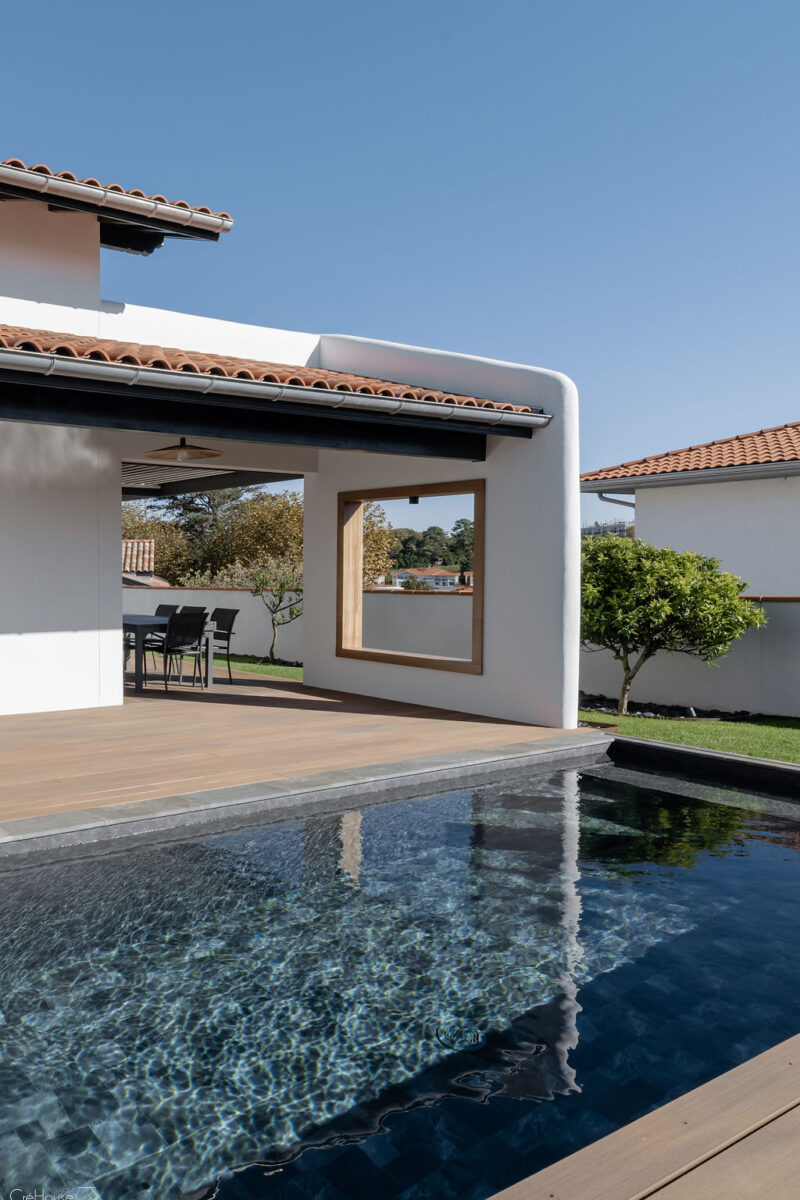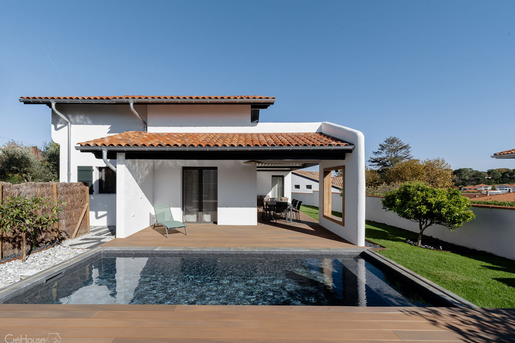 Le projet consistait à concevoir une maison contemporaine familiale tournée vers la lumière naturelle et les espaces de vie partagés. L’implantation a été pensée pour optimiser les circulations intérieures avec une logique fluide reliant garage, buanderie, cuisine ouverte et séjour. Le cœur de la maison : une cuisine conviviale, prolongée par une salle à manger largement vitrée pour créer de véritables relations dedans-dehors vers le jardin, la terrasse et la piscine.