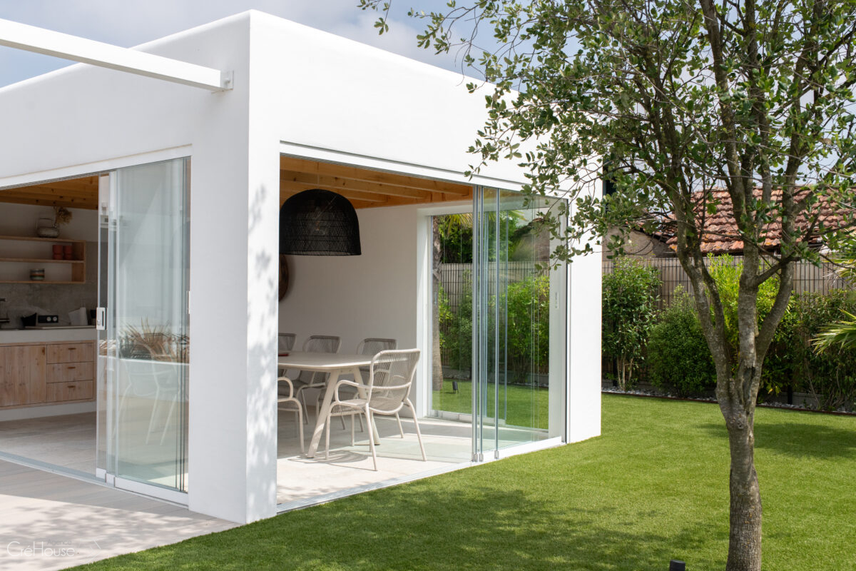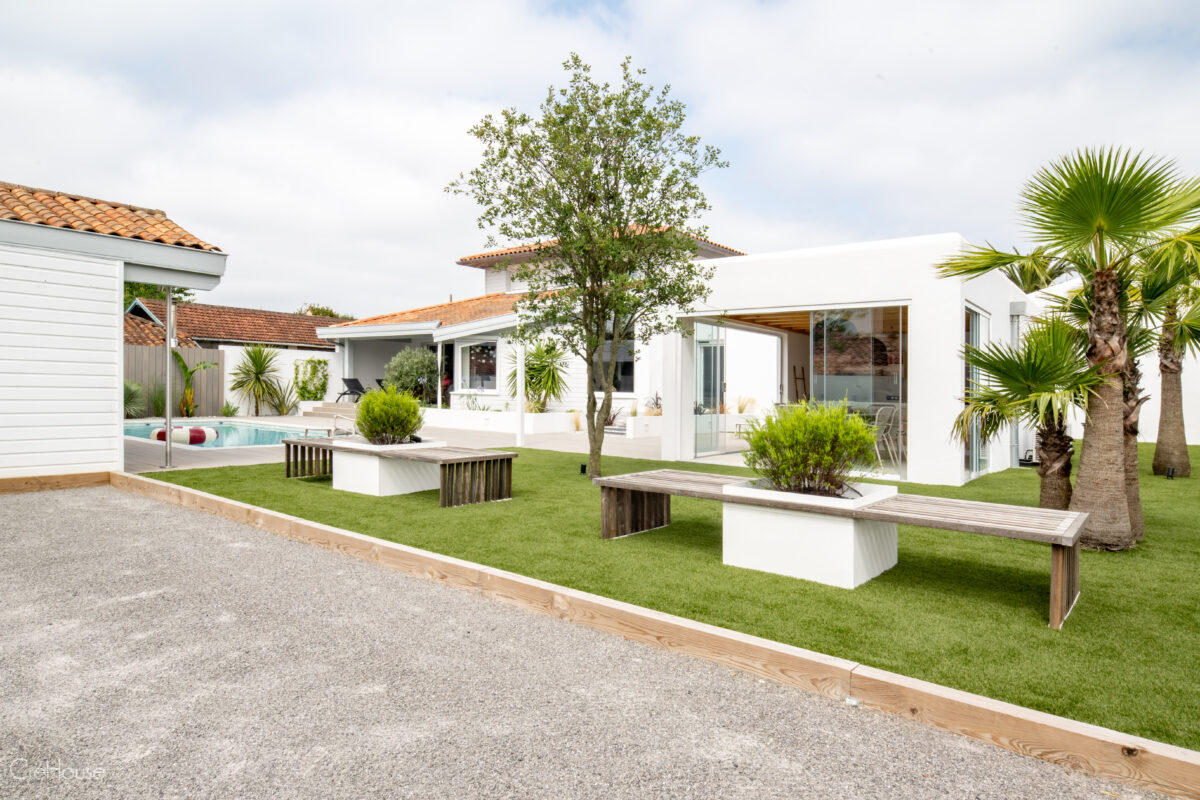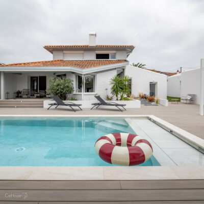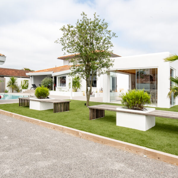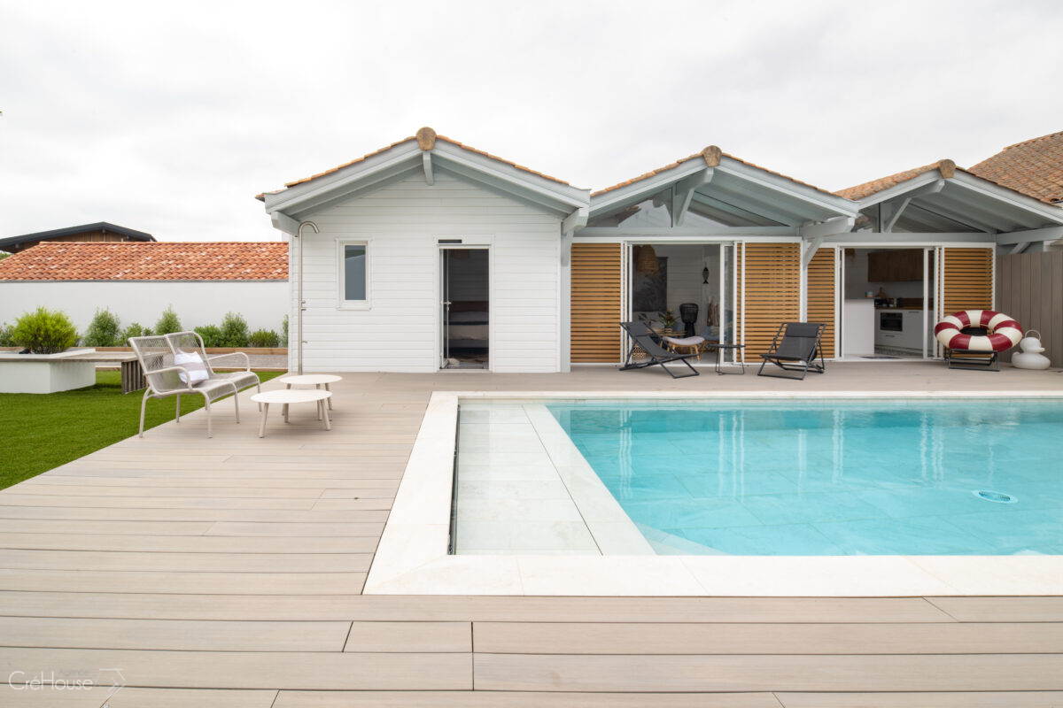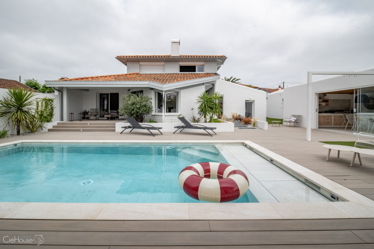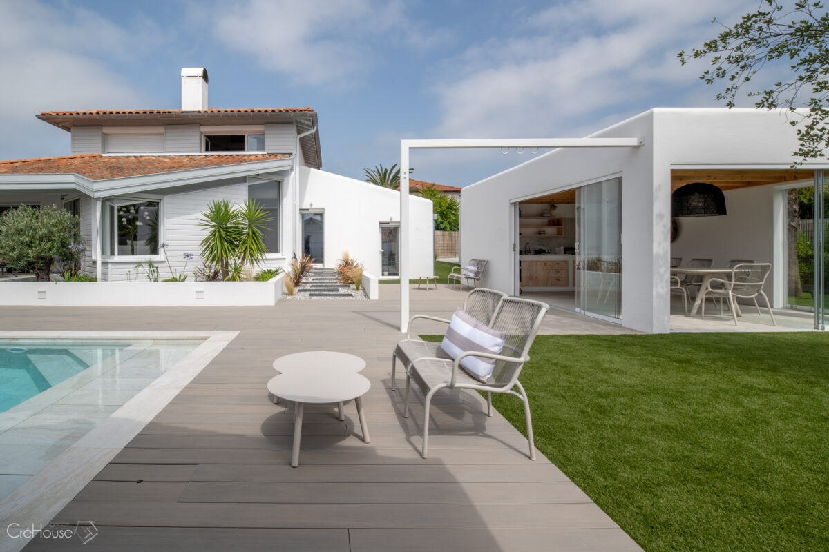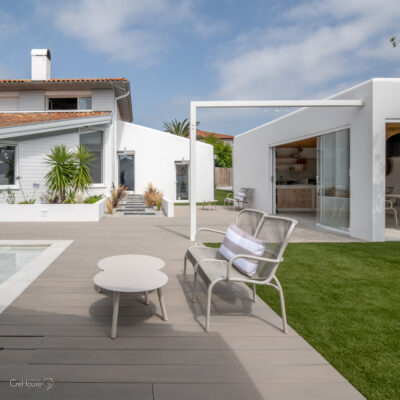 Les extérieurs ont également fait l’objet d’une transformation majeure. La démolition des deux garages existants a libéré le terrain pour développer un nouvel espace de vie comprenant une grande cuisine d’été, un boulodrome et la reconfiguration de la piscine, pensée pour s’intégrer harmonieusement au nouvel aménagement. L’ensemble crée un véritable prolongement de la maison vers l’extérieur, offrant un cadre convivial, familial et cohérent avec la rénovation globale.