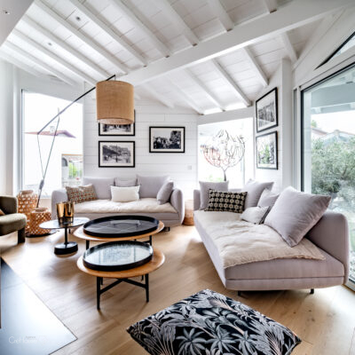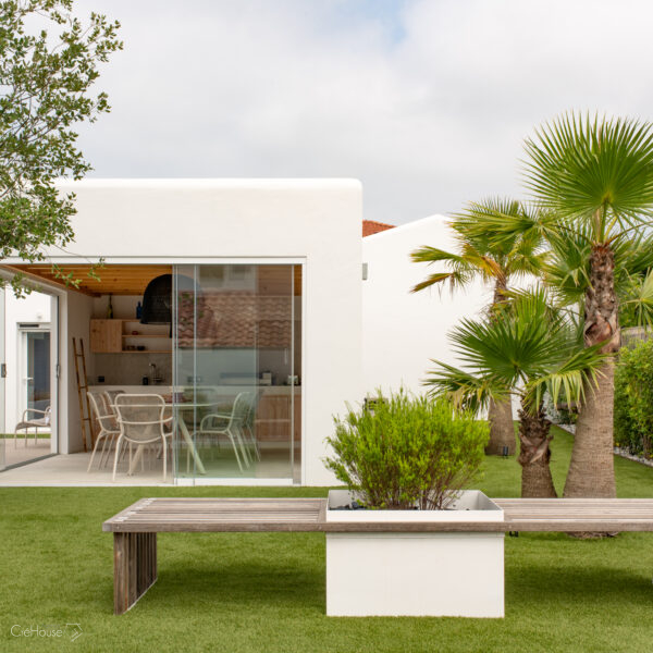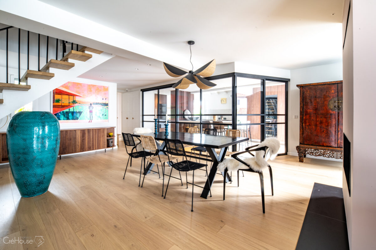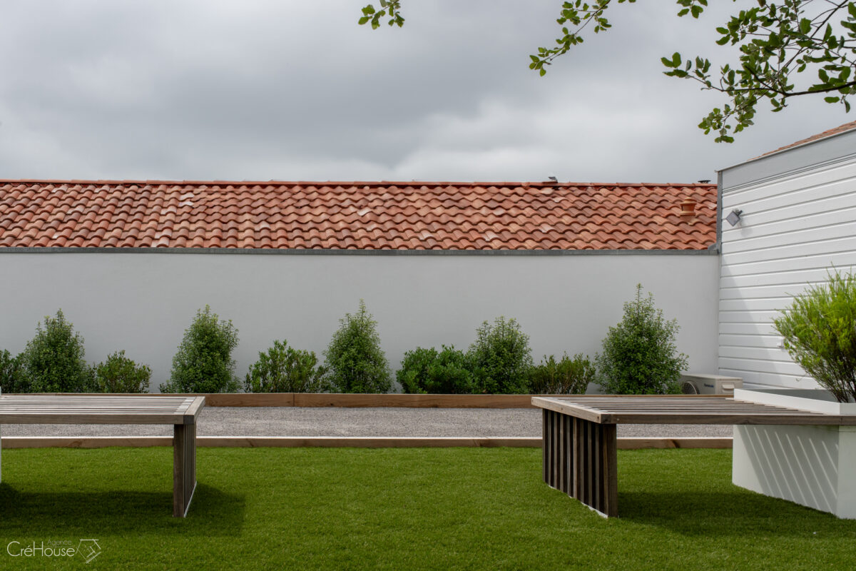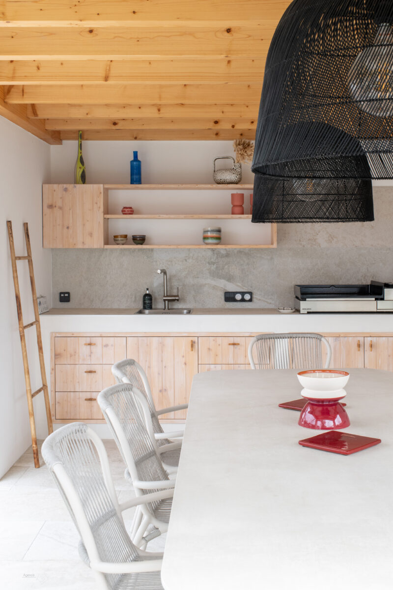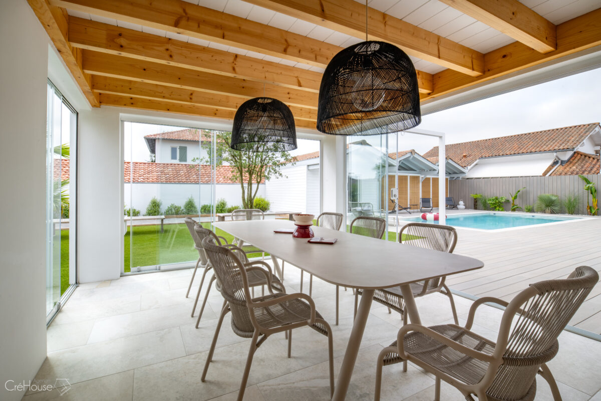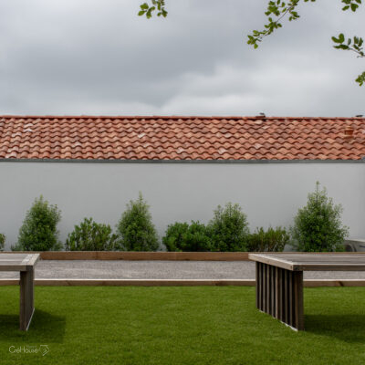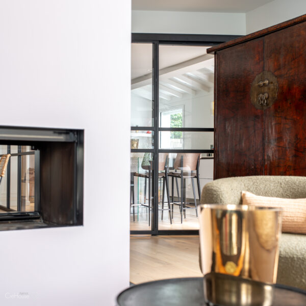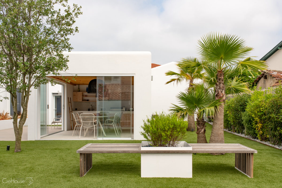 Les extérieurs ont également fait l’objet d’une transformation majeure. La démolition des deux garages existants a libéré le terrain pour développer un nouvel espace de vie comprenant une grande cuisine d’été, un boulodrome et la reconfiguration de la piscine, pensée pour s’intégrer harmonieusement au nouvel aménagement. L’ensemble crée un véritable prolongement de la maison vers l’extérieur, offrant un cadre convivial, familial et cohérent avec la rénovation globale.