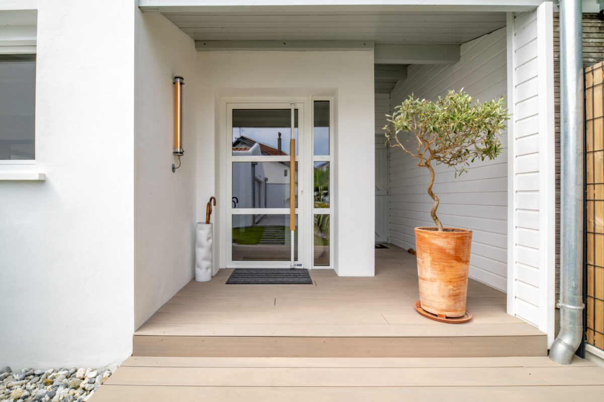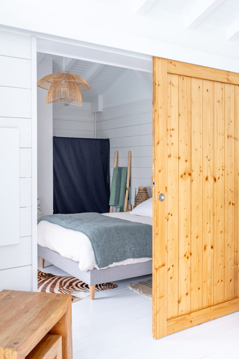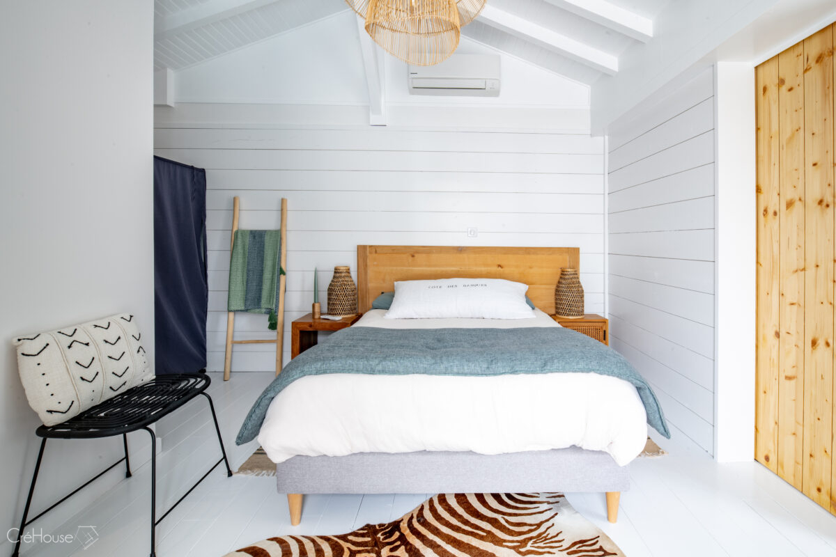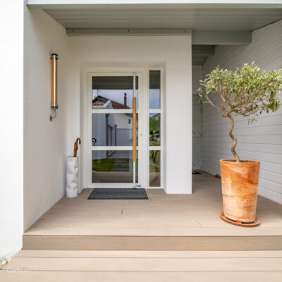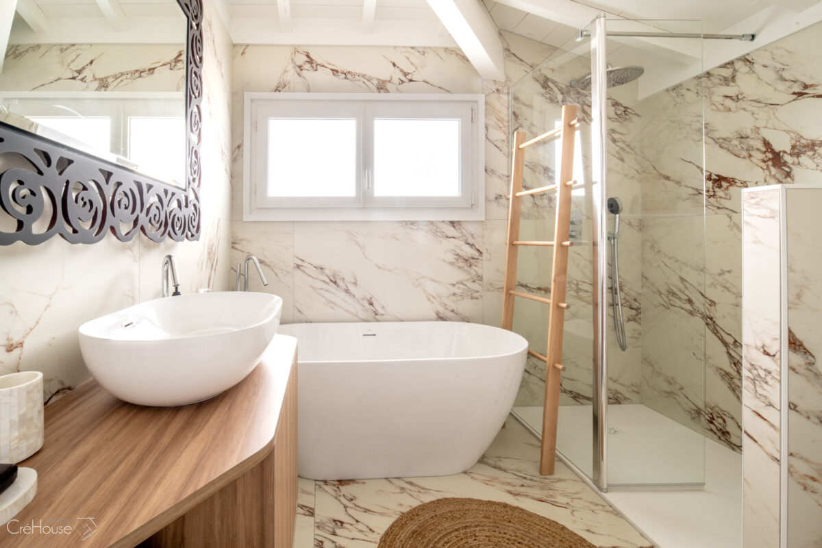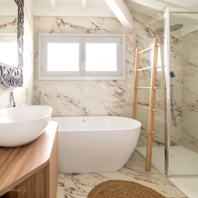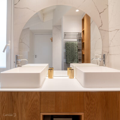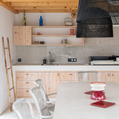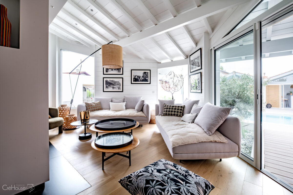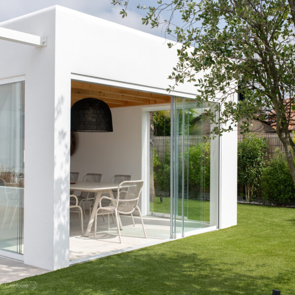 Les extérieurs ont également fait l’objet d’une transformation majeure. La démolition des deux garages existants a libéré le terrain pour développer un nouvel espace de vie comprenant une grande cuisine d’été, un boulodrome et la reconfiguration de la piscine, pensée pour s’intégrer harmonieusement au nouvel aménagement. L’ensemble crée un véritable prolongement de la maison vers l’extérieur, offrant un cadre convivial, familial et cohérent avec la rénovation globale.